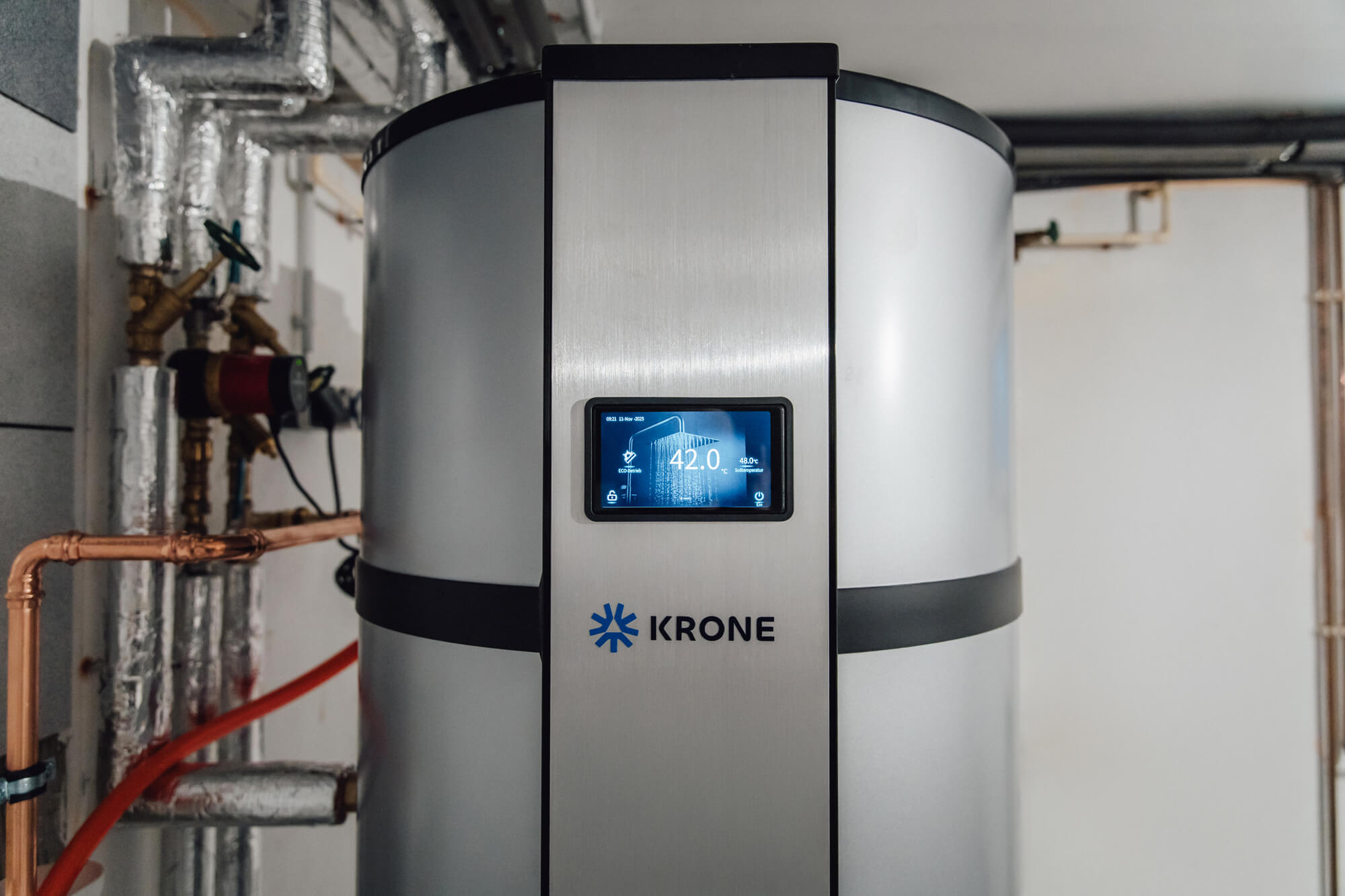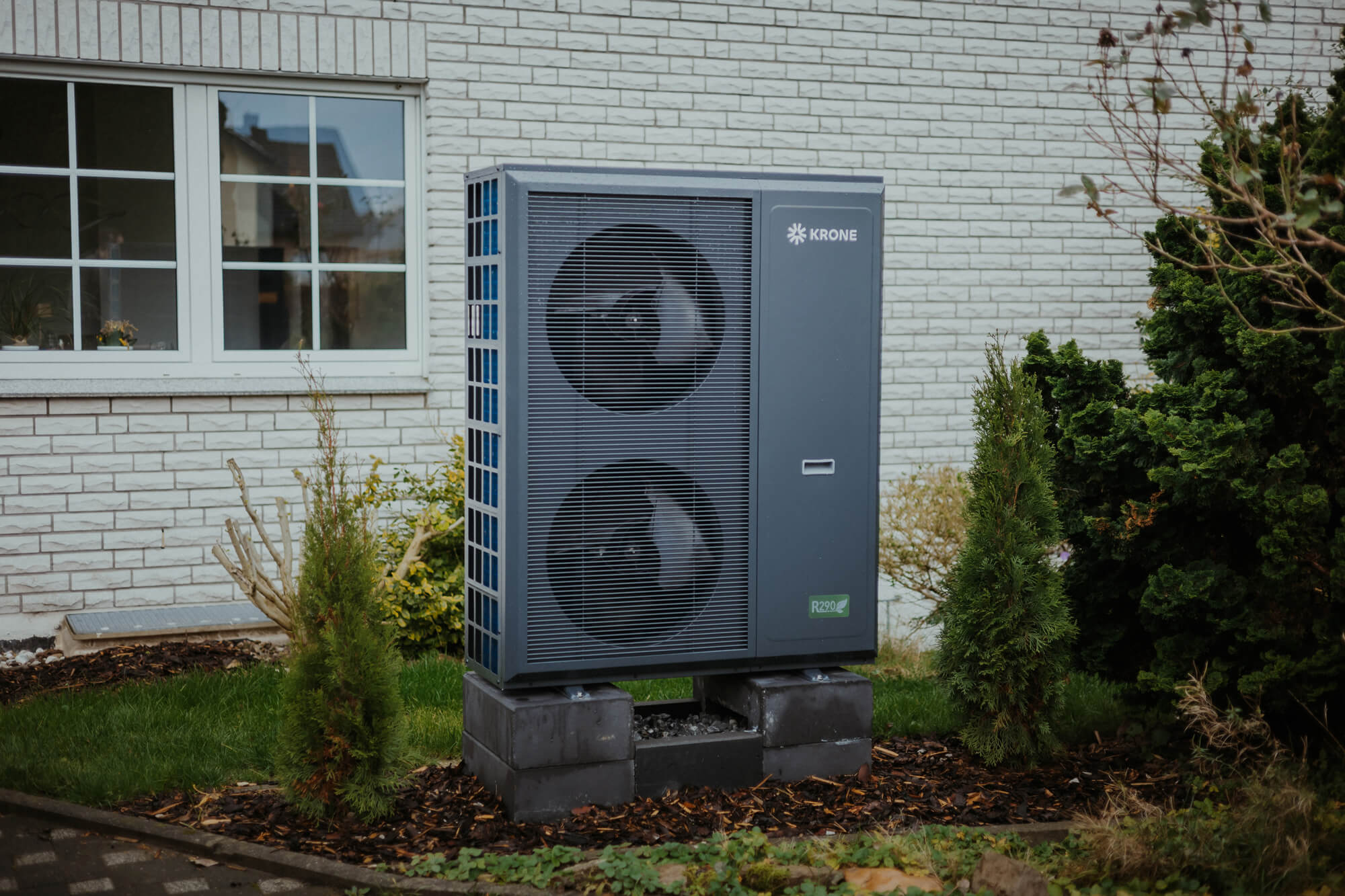 Die bisherige Gasheizung wurde vollständig durch eine KRONE ECOSENSE R290 Monoblock-Wärmepumpe (12,8 kW) ersetzt. Für die Warmwasserbereitung kommt ergänzend die KRONE BWS-125-300 Brauchwasserwärmepumpe zum Einsatz. Diese Trennung von Heizen und Warmwasser führt zu: